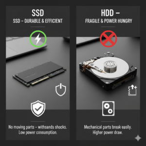 Abuja experiences occasional power fluctuations and surges. SSDs are more resistant to shock and power interruptions because they have no moving parts. HDDs, on the other hand, can fail if dropped or exposed to sudden electricity issues. For laptops carried around Abuja or for small businesses, SSDs are safer and more reliable.